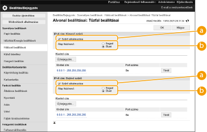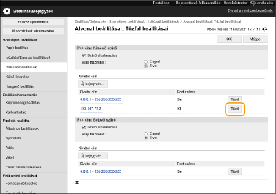[Hálózati beállítások] [IP cím gátlás napló] részben lehet megtekinteni. Az elutasított kommunikációs kérelmek előzményeit a Távoli felhasználói felületről lehet exportálni CSV formátumban. Napló exportálása fájlkéntHa az [Alap házirend] beállítása [Elvet], a tűzfal által elutasított kommunikációs kérelmek előzményeit nem jeleníti meg az [IP cím gátlás napló].