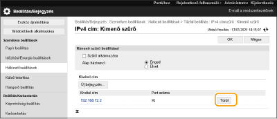 [Kimenő szűrő] vagy [Bejövő szűrő] lehetőségre az [IPv4 címszűrő]/[IPv6 címszűrő] elemnél.