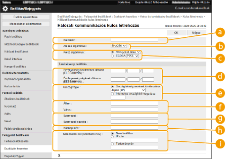 Ha az [SHA384] vagy az [SHA512] lehetőséget választja az [Aláírás algoritmus] beállításnál, a kulcshossz nem állítható [512-bit] értékre, ha az [RSA] lehetőség van kiválasztva a [Kulcs algoritmus] beállításnál.