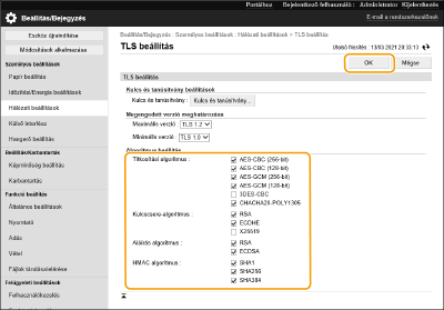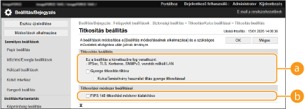 A [FIPS 140 titkosítási módszer kialakítása] lehetőség nem használható, ha a [CHACHA20-POLY1305] vagy a [X25519] opció van kiválasztva.