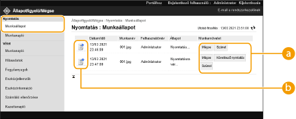 A Távoli felhasználói felületben ellenőrizheti a feldolgozásra váró dokumentumok állapotát, valamint a már feldolgozott dokumentumokról szóló naplókat. Emellett a készülék állapotát, például a hibainformációkat és a fogyóanyagok maradék mennyiségét is ellenőrizheti.