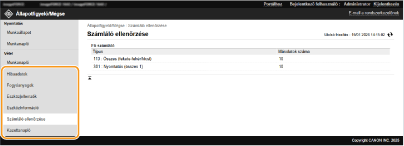 Számos különféle információt ellenőrizhet a készülékkel kapcsolatban, például a hibainformációkat, a maradék papír és festék mennyiségét, a csatlakoztatott kiegészítő berendezésekkel kapcsolatos információkat és az adott időpontig kinyomtatott összes oldal számát.