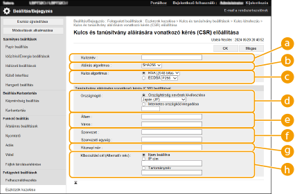A készüléken előállított tanúsítványok nincsenek CA aláírással ellátva, ami egyes kommunikációs partnerek esetében kommunikációs hibákat okozhat. CA aláírással ellátott tanúsítvány igényléséhez tanúsítvány-aláírási kéréshez (CSR) kapcsolódó adatok szükségesek. CSR-t rendszergazdai jogosultságokkal bejelentkező felhasználók állíthatnak elő.
