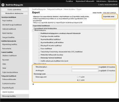 Az összes beállítási adat titkosításához válassza a [2. szint] lehetőséget a [Biztonsági szint] menüpontban.