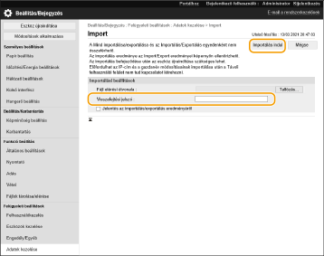 Ha egy olyan másik nyomtatóra/többfunkciós nyomtatóra importálja a részlegazonosító-kezelési beállításokat, amelyen engedélyezve van a részlegazonosító-kezelés, a rendszerkezelő információi felülíródnak, aminek következtében előfordulhat, hogy a korábbi rendszerkezelői azonosítóval és PIN-kóddal nem fog tudni bejelentkezni. Mielőtt elvégezné ezt a műveletet, ellenőrizze a Rendszerkezelőnek az exportáló készüléken elmentett információit.