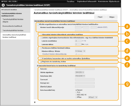 A készülékkel előállított kulcsokhoz szükséges tanúsítvány kibocsátására vonatkozó kérelmet lehet küldeni egy tanúsítványokat kezelő SCEP- (Simple Certificate Enrollment Protocol, egyszerű tanúsítványigénylési protokoll) kiszolgálónak. Az SCEP-kiszolgáló által kibocsátott tanúsítványokat a készülék automatikusan bejegyzi. Tanúsítvány kibocsátására vonatkozó kérelem küldéséhez Administrator jogosultságok szükségesek.