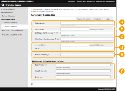A bejelentkezési rendeltetési hely tartománynevének beállítási módját adhatja meg. A tartománynév közvetlen megadásához válassza a [Tartománynév megadása] lehetőséget, és írja be a tartománynevet. Olyan LDAP-adatmező (attribútumnév) megadásához, amelyből az LDAP-szerveren kiolvasható a tartománynév, válassza a [A tartománynév megállapításához használandó attribútumnév megadása] lehetőséget, és írja be az attribútumnevet (Példa:dc).