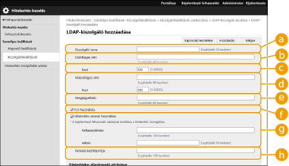 Az LDAP-szerverhez való névtelen hozzáférés engedélyezéséhez törölje a jelölőnégyzet bejelölését. Csak akkor érvényes, ha az LDAP-szerver is úgy van beállítva, hogy engedélyezze a névtelen hozzáférést. Ha a hitelesítéshez a felhasználónevet és a jelszót használja, jelölje be a jelölőnégyzetet, és írja be a [Felhasználónév:] és [Jelszó:] mezők értékeit.