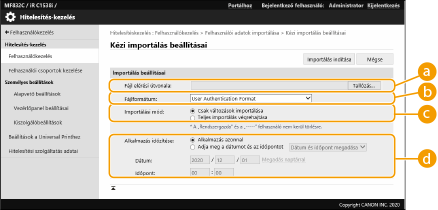 Teljes importálás végrehajtásakor az importált fájlban nem szereplő felhasználók törlődnek a készülékről. Az alapértelmezetten bejegyzett „-----” és „Administrator” felhasználók azonban akkor is megmaradnak, ha nem szerepelnek az importált fájlokban.