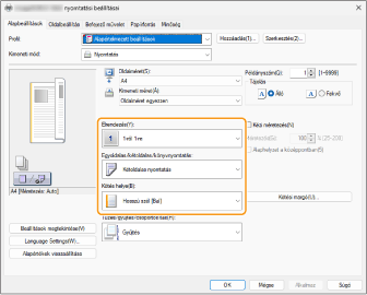 A nyomtatási előnézet ellenőrzése közben adja meg az [Elrendezés] [Oldalsorrend] [Egyoldalas/kétoldalas/könyvnyomtatás] [Kötés helye] beállítást.