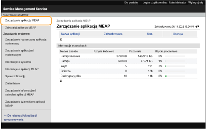 Możesz sprawdzić liczbę zainstalowanych aplikacji i wykorzystane miejsce na nośniku pamięci. Zarządzanie aplikacjami MEAP