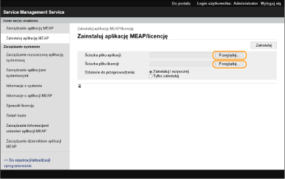 Jeżeli do aplikacji MEAP nie dołączono Kodu dostępowego licencji, plik licencji zostanie przesłany przez dostawcę aplikacji MEAP. Klucz licencji oraz plik licencji opisany w niniejszej sekcji nie są wymagane. Aby uzyskać więcej informacji, zapoznaj się z instrukcją obsługi danej aplikacji MEAP.