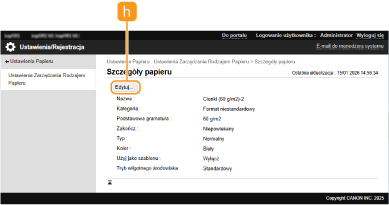 Aby zarejestrować niestandardowe typy papieru albo zmienić ustawienia zarejestrowanych niestandardowych typów papieru, należy zalogować się jako administrator. Logowanie do urządzenia