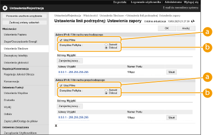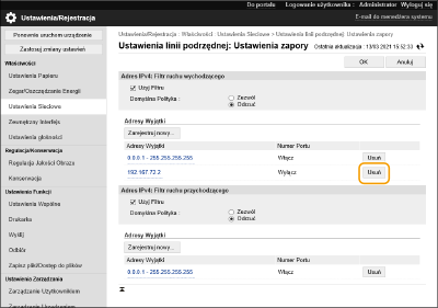 [Ustawienia Sieciowe] [Rejestr Blokady Adresu IP]. Historię zablokowanej komunikacji można eksportować z poziomu interfejsu Remote UI (Zdalny interfejs użytkownika) w formacie pliku CSV. Eksportowanie rejestru do plikuJeśli ustawienie opcji [Domyślna Polityka] na [Odrzuć], historia komunikacji zablokowanej przez zaporę nie jest wyświetlana w obszarze [Rejestr Blokady Adresu IP].