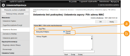 Nieprawidłowo wprowadzone adresy MAC mogą uniemożliwić dostęp do urządzenia z poziomu Zdalnego interfejsu użytkownika. Konieczne będzie wtedy ustawienie filtra <Filtr Adresu MAC> na wartość <Wyłącz>.