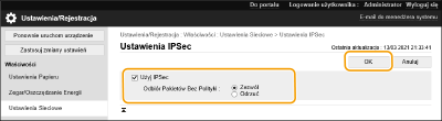 kliknij [Usuń] [OK].Korzystanie z Panelu sterowaniaKomunikację szyfrowaną z użyciem protokołu IPSec można również włączyć albo wyłączyć z poziomu <Ustaw> na ekranie <Ekran główny>. <Ustawienia IPSec>