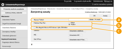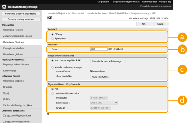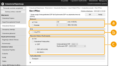Ustaw okres ważności wygenerowanego IPSec SA. Upewnij się, że ustawiono opcję [Czas] lub [Rozmiar]. W przypadku ustawienia obu wartości zastosowane zostanie ustawienie z wartością, która zostanie osiągnięta jako pierwsza.
