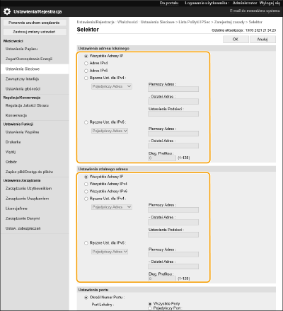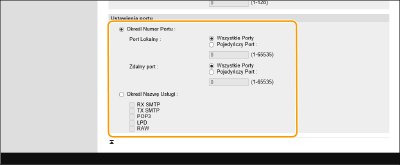 Wybierz [Określ Numer Portu], aby wykorzystać numery portów podczas określania portów, do których IPSec ma zastosowanie. Wybierz [Wszystkie Porty], aby zastosować IPSec do wszystkich portów. Aby zastosować IPSec do danego numeru portu, wybierz [Pojedyńczy Port] i wprowadź numer portu. Określ porty tego urządzenia w polu [Port Lokalny] oraz określ adres port drugiego urządzenia do komunikacji w polu [Zdalny port].