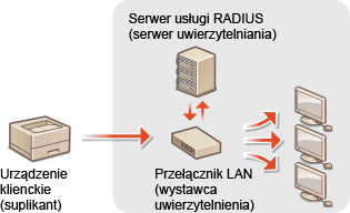 Każde urządzenie, które próbuje nawiązać połączenie i rozpocząć komunikację z siecią 802.1X zostaje poddane procesowi uwierzytelnienia, aby potwierdzić uprawnienia użytkownika. Informacje uwierzytelniające są wysyłane na serwer RADIUS i tam sprawdzane. Serwer zezwala na nawiązanie komunikacji lub odrzuca próbę w zależności od wyniku procesu uwierzytelniania. Jeśli uwierzytelnianie zostanie zakończone niepowodzeniem, przełącznik sieci LAN (lub punkt dostępowy) blokuje dostęp spoza sieci. Urządzenie można podłączyć do sieci 802.1X jako urządzenie klienckie.