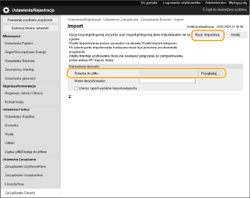 Podczas importowania ustawień Zarządzania ID wydziału do innej drukarki/drukarki wielofunkcyjnej z włączoną funkcją Zarządzania ID wydziału, informacje o menedżerze systemu zostaną nadpisane, co może uniemożliwić zalogowanie się z wykorzystaniem poprzedniego ID i kodu PIN menedżera systemu. Przed rozpoczęciem tych działań sprawdź informacje o menadżerze systemu zapisane w urządzeniu eksportującym.