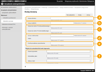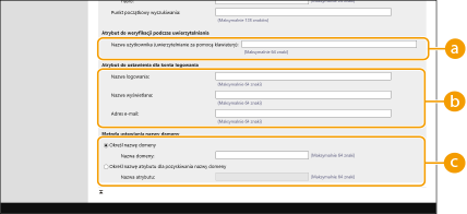 Wybierz sposób ustawiania nazwy domeny osoby logującej się. Aby określić bezpośrednio nazwę domeny, wybierz opcję [Określ nazwę domeny] i wprowadź nazwę domeny. Aby określić pole danych LDAP (nazwa atrybutu) z którego nazwa domeny na serwerze LDAP ma być uzyskana, wybierz [Określ nazwę atrybutu dla pozyskiwania nazwy domeny] i wprowadź nazwę atrybutu (Przykład: dc).