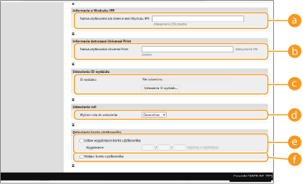 Jeśli nazwa użytkownika jest numeryczna i składa się z siedmiu cyfr lub mniej, ten sam numer jest przypisywany do tego samego użytkownika jako identyfikator wydziału. Jeśli hasło tego samego użytkownika jest zarejestrowane jako numer, który składa się z siedmiu cyfr lub mniej, jest ono również ustawiane jako kod PIN dla tego identyfikatora wydziału.