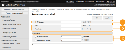 Możesz organizować i zarządzać użytkownikami w grupie w oparciu o NI wydziału. Należy postępować zgodnie z poniższą procedurą, aby skonfigurować Zarządzanie ID wydziału i aktywować funkcję zliczania arkuszy papieru wykorzystanych do drukowania przez urządzenie.