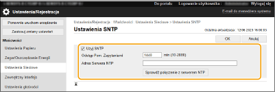 Możesz sprawdzić status komunikacji pomiędzy urządzeniem a zarejestrowanym serwerem przy użyciu SNTP. Jednakże, wyłącznie status komunikacji jest potwierdzany i regulacje czasu nie są przeprowadzane.