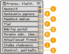 <Nastavenia funkcie>, <Predvoľby> a mnohé ďalšie nastavenia zariadenia sa začínajú týmto tlačidlom.