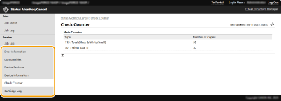 Môžete si pozrieť množstvo informácií o zariadení, ako sú informácie o chybách, množstvo zostávajúceho papiera a tonera, informácie o pripojených voliteľných zariadeniach alebo celkový počet doposiaľ vytlačených strán.