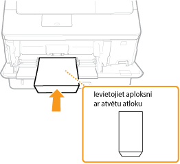 Ievietojiet aploksnes papīra atvilktnē vai universālajā paliktnī. Lai izvairītos no papīra iestrēgšanas un saburzīšanas, apdrukājot aploksnes, pirms aplokšņu ievietošanas noteikti izlīdziniet visas nelīdzenās virsmas. Pievērsiet arī uzmanību, kādā orientācijā tiek ievietotas aploksnes un kura puse ir novietota uz augšu. Ņemiet vērā, ka aploksnes un pastkartes nedrīkst ievietot papīra atvilktnē.