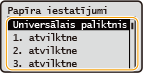 Ja jums ir bieži jāmaina ievietojamais papīrs, izmantojiet opciju <Brīvs> — tādējādi katrā iekārtas lietošanas reizē varēsit mainīt iestatījumu, veicot mazāku skaitu darbību. Tomēr ņemiet vērā, ka šis iestatījums ļauj iekārtai veikt drukāšanu arī tad, ja printera draiverī iestatītais papīra tips neatbilst iekārtā faktiski ievietotajam papīra veidam.