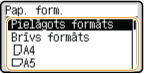 Ja jums ir bieži jāmaina ievietojamais papīrs, izmantojiet opciju <Brīvs formāts> — tādējādi katrā iekārtas lietošanas reizē varēsit mainīt iestatījumu, veicot mazāku skaitu darbību. Ja iestatījums printera draiverī ievērojami atšķiras no ievietotā papīra formāta, iekārtā var arī tikt parādīts kļūdas ziņojums. <Pap. form. neatb. br. form. pap. avotam>