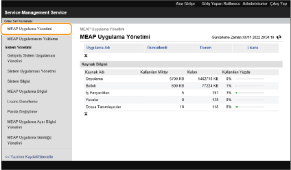 Yüklü uygulamaların sayısını ve kullanılan depolama cihazı alanını kontrol edebilirsiniz. MEAP Uygulamalarını Yönetme