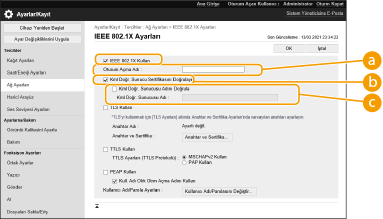 IEEE 802.1X kimlik doğrulaması kullanan bir ağ ortamında, yetkisiz ağ erişimi yalnızca kimlik doğrulama sunucusu (RADIUS sunucusu) tarafından yetkilendirilmiş istemci cihazlara (izin isteyenler) erişim ayrıcalıkları veren bir LAN anahtarı tarafından engellenir. Bu makineyi bir IEEE 802.1X ağına bağlamak için, kimlik doğrulama sunucusu tarafından kullanılan kimlik doğrulama yöntemi gibi ayarların makine üzerinde yapılandırılmış olması gerekir. Bu ayarları yapılandırmak için Administrator ayrıcalıkları gereklidir. [IEEE 802.1X Ayarları], hem ana hat hem de alt hat için mevcuttur. Ayarları gereken şekilde kaydedin.