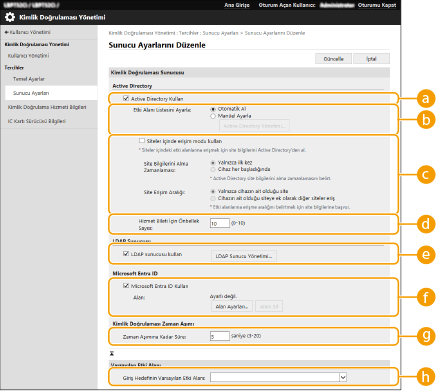 LDAP sunucusu anonim erişime izin verecek şekilde ayarlanmışsa, LDAP sunucusuna anonim erişime izin vermek için onay kutusunun işaretini kaldırın. Kimlik doğrulaması için ad ve parola kullanırken onay kutusunu seçip [Kullanıcı Adı:] ve [Parola:] değerlerini girin.