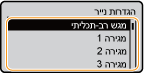אם אתה מחליף לעתים קרובות את הנייר הנטען, הגדר מצב <חופשי>. כך תקטין את מספר השלבים הדרוש להחלפת ההגדרה בכל פעם. עם זאת, שים לב שהגדרה זאת מאפשרת למכשיר לבצע הדפסה גם אם ישנה אי התאמה בין הגדרת סוג הנייר במנהל המדפסת לבין סוג הנייר הקיים במכשיר.
