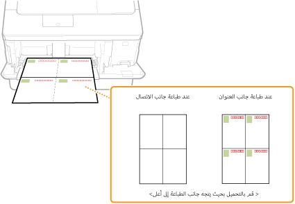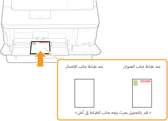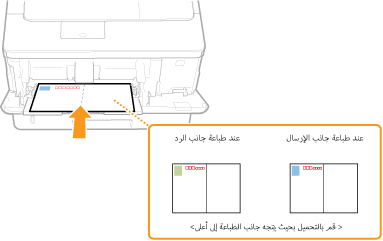 أدخل البطاقة البريدية بحيث يكون الوجه المطبوع لأعلى، مع وضع الحافة القصيرة باتجاه الجهاز إذا كان نوع البطاقة البريدية هو Regular أو 4-on-1، أو Long Edge باتجاه الجهاز إذا كان نوع البطاقة البريدية هو reply.