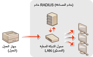 في بيئة الشبكة التي تستخدم مصادقة IEEE 802.1X، يتم حظر الوصول غير المصرح به إلى الشبكة من خلال مفتاح LAN (المصدّق) الذي يمنح امتيازات الوصول فقط لأجهزة العميل (العملاء) المصرح بها من قِبل خادم المصادقة (خادم RADIUS). لتوصيل هذا الجهاز بشبكة IEEE 802.1X، يجب تكوين إعدادات مثل طريقة المصادقة المستخدمة من قِبل خادم المصادقة على الجهاز. يلزم توفر امتيازات المسؤول لتكوين هذه الإعدادات. [IEEE 802.1X Settings] موجود لكل من الخط الرئيسي والخط الفرعي. سجِّل الإعدادات حسب الحاجة.