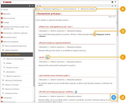 Kliknite, da določite nastavitve, kot so velikost besedila, postavitev in način prikaza za Navodila za uporabo.