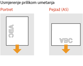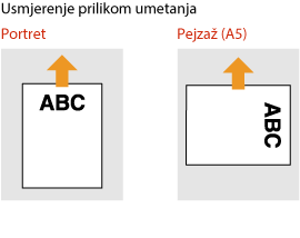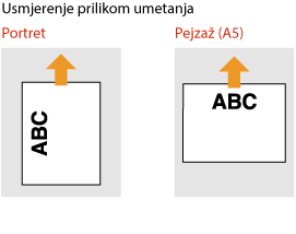U ovom se odjeljku opisuje umetanje već ispisanog papira s ispravnom orijentacijom. Opis općenitog postupka umetanja papira u ladicu za papir ili višenamjensku ladicu potražite u odjeljku Osnovni načini umetanja papira.