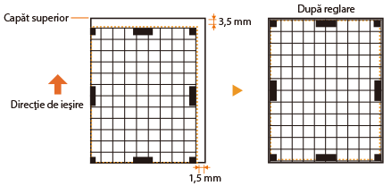 Reglați poziția de imprimare după ce verificați direcția și distanța pentru reglare. Poziția de imprimare poate fi reglată în intervalul de la -3,5 mm până la +3,5 mm atât pe direcție orizontală, cât și pe direcție verticală, în incremente de 0,1 mm.