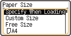 After the default paper setting is registered, the paper setting screen is not displayed when paper is loaded, and the same setting is always used. If you load a different paper size or type without changing the paper settings, the machine may not print properly. To avoid this problem, select <Specify When Loading Paper> in step 3, and then load the paper. |