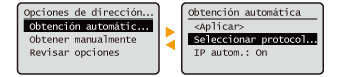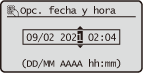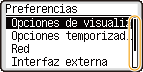 Puede cambiar una variedad de opciones relacionadas con la pantalla, como por ejemplo el idioma de la pantalla: <Opciones de visualización>Puede cambiar la pantalla que se muestra automáticamente cuando la máquina permanece inactiva durante un periodo de tiempo especificado: <Función tras reinicio automático>Puede cambiar una variedad de opciones relacionadas con la accesibilidad, como por ejemplo la velocidad de desplazamiento: <Accesibilidad> |