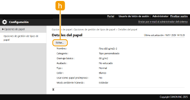 Para registrar los tipos de papel personalizados o cambiar las opciones de los tipos de papel personalizados registrados, es necesario iniciar sesión como administrador. Inicio de sesión en el equipo Cuando se registra el tipo de papel personalizado, no se puede especificar la fuente de papel. Para obtener más información sobre el registro de la fuente de papel, consulte Especificación del tamaño y tipo de papel en el casete. Puede importar/exportar la información del tipo de papel personalizado registrado y compartirla con otro equipo de Canon. Importar/exportar todas las opciones |
