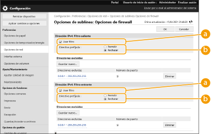 Consultar las solicitudes de comunicación bloqueadas en el registroLas últimas 100 comunicaciones bloqueadas por el cortafuegos se podrán comprobar en [Configuración] [Opciones de red] [Registro de direcciones IP bloqueadas]. El historial de comunicaciones bloqueadas puede exportarse desde la IU remota en formato CSV. Exportar un registro como archivoSi se establece [Directiva prefijada] en [Rechazar], no se muestra el historial de comunicaciones bloqueadas por el cortafuegos en [Registro de direcciones IP bloqueadas]. Uso del panel de controlTambién podrá activar o desactivar el filtrado de direcciones IP desde <Establecer> en la pantalla <Inicio>. <Red> Importación por lotes/Exportación por lotesEsta opción puede importarse/exportarse con modelos que admitan la importación de lotes de esta opción. Importación/exportación de datos de configuración Esta opción se incluye en [Información básica de configuración] en las exportaciones por lotes. Importar/exportar todas las opciones |
