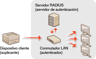 En un entorno de red que utiliza la autenticación IEEE 802.1X, el acceso no autorizado a la red es bloqueado por un conmutador LAN (autenticador) que solo concede privilegios de acceso a los dispositivos cliente (solicitantes) que están autorizados por el servidor de autenticación (servidor RADIUS). Para conectar esta máquina a una red IEEE 802.1X, es necesario configurar en la máquina ajustes como el método de autenticación utilizado por el servidor de autenticación. Se requieren privilegios de administrador para configurar estos ajustes. [Opciones de IEEE 802.1X] existe tanto para la línea principal como para la línea secundaria. Registre las opciones según sea necesario.