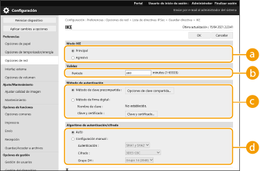 2 | Configure las opciones necesarias. ![]() [Modo IKE]Seleccione el modo de funcionamiento para el protocolo de intercambio de claves. La seguridad mejora si selecciona [Principal] porque la propia sesión IKE está cifrada, pero la velocidad de la sesión en más lenta que con [Agresivo], que no cifra toda la sesión. [Validez]Configure el periodo de caducidad para la SA de IKE generada. [Método de autenticación]Seleccione uno de los métodos de autenticación descritos a continuación.