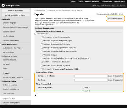 Escriba la contraseña en [Contraseña de cifrado] seleccione el nivel de seguridad en [Nivel de seguridad]  haga clic en [Iniciar exportación]  [Bien].