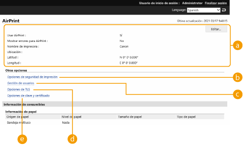 Si inicia sesión con privilegios de administrador, también puede cambiar las opciones de AirPrint desde la página para AirPrint.